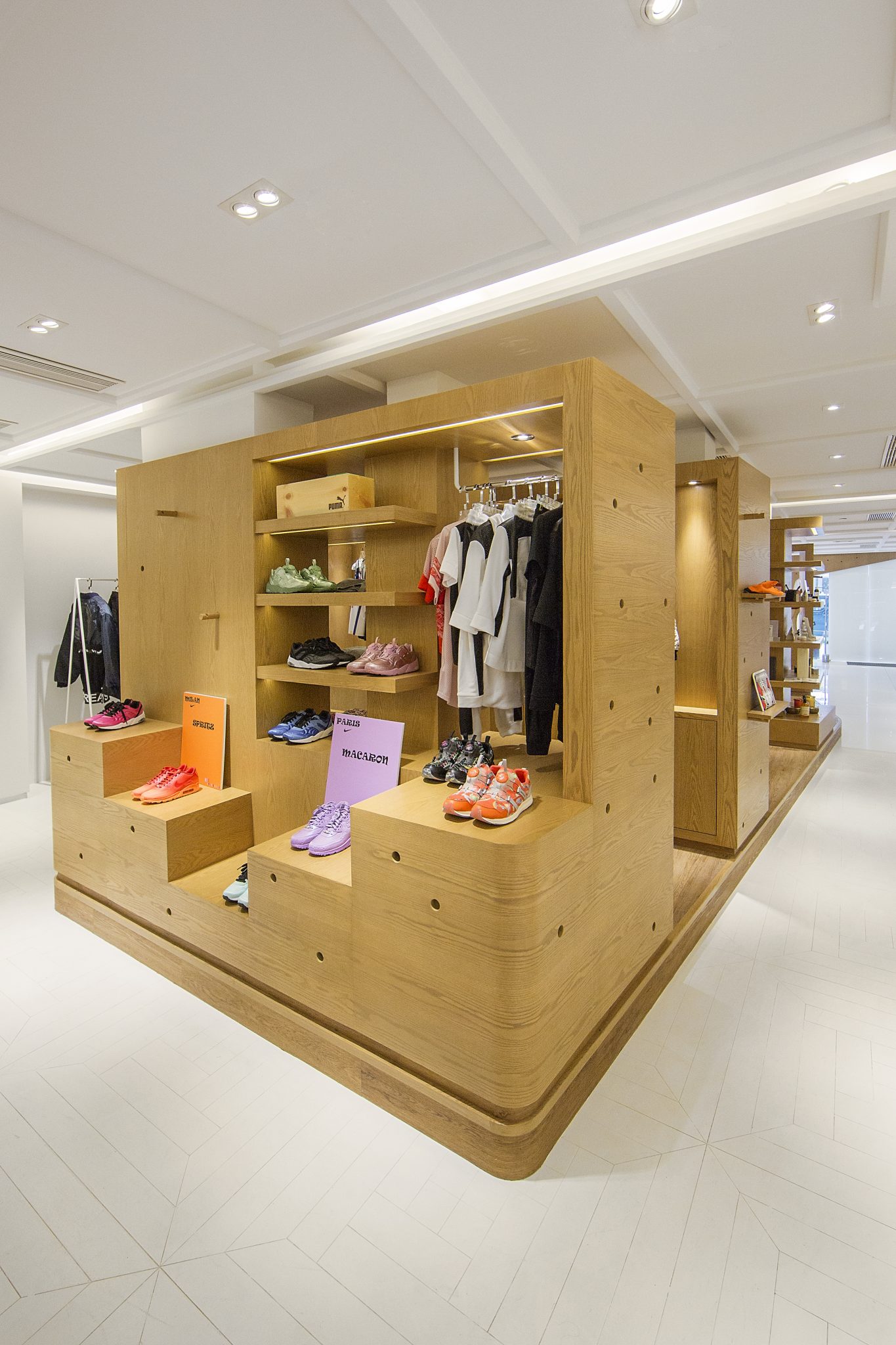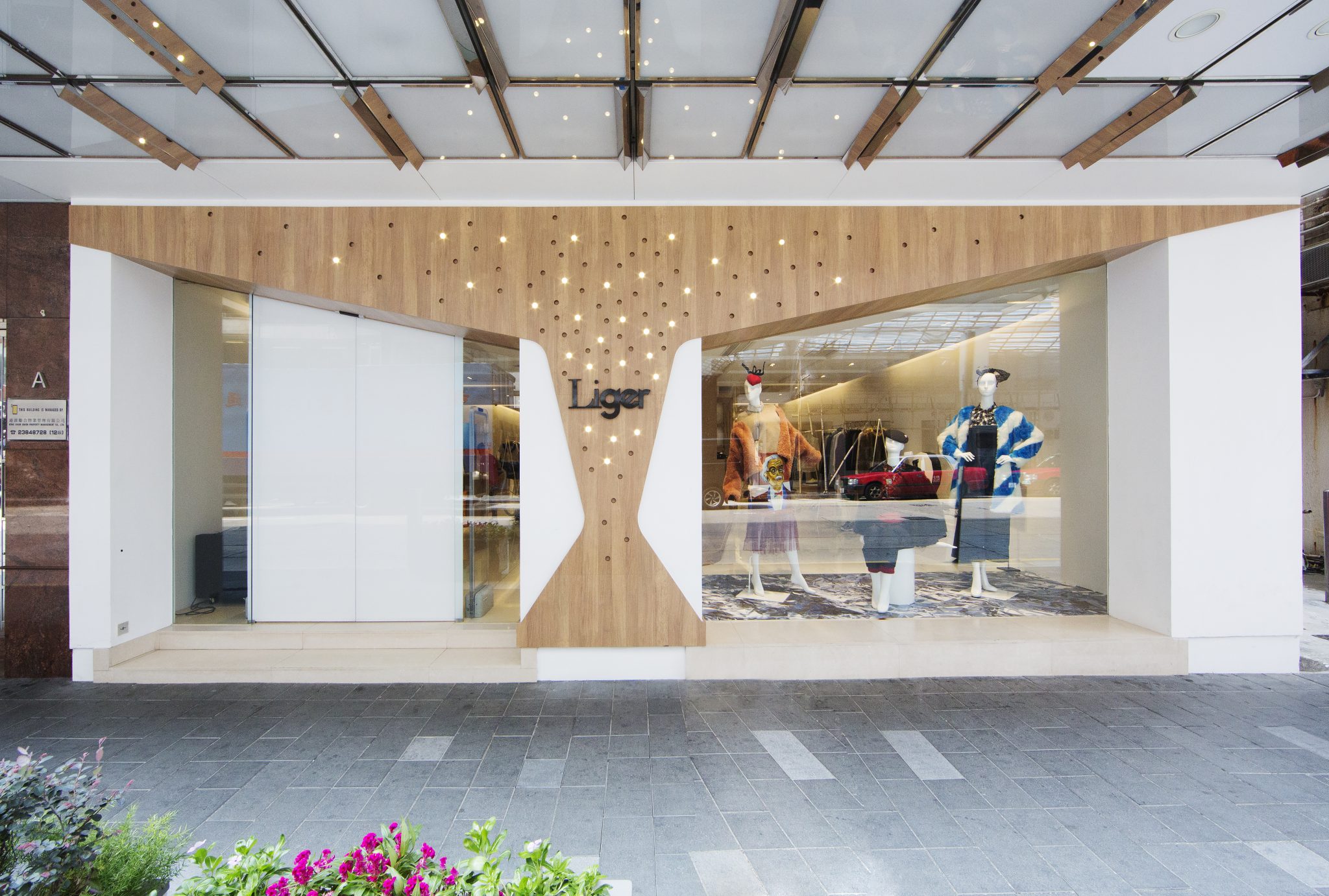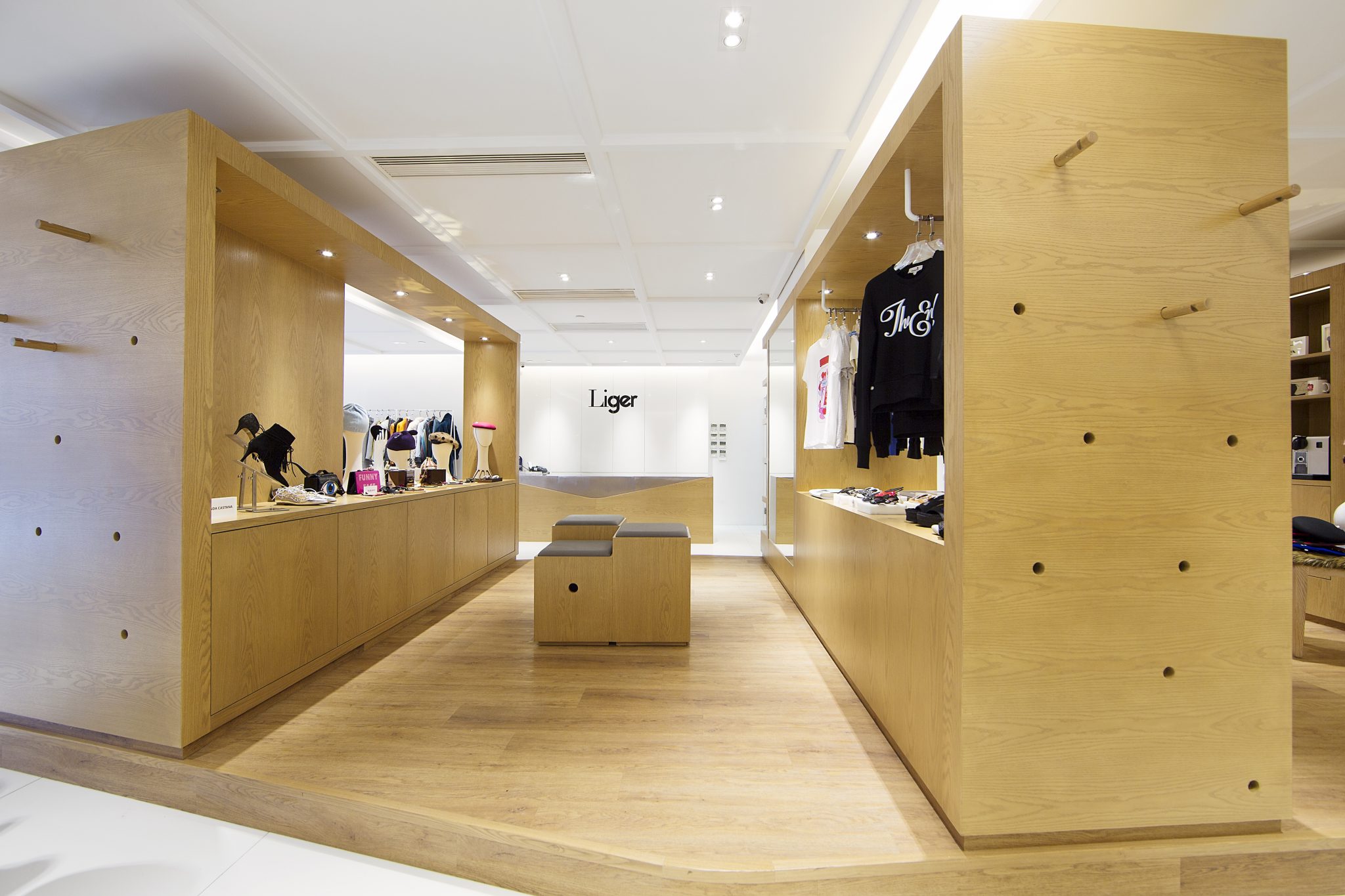 The design concept for the flagship store is to develop a space that will foster relaxed browsing while also cultivating a rich texture of experiences. The first priority of the design is to provide as much space as possible for products, and organize them in such a manner that allows for a degree of flexibility balanced against giving the space an overall brand identity. The island and façade are the key design features that work in parallel to re-shape the store and re-cast the Liger brand. The island is designed as an object in the space that at once allows guests to flow around it (browsing racks of various lines of clothing), while at the same time allowing guests to short cut through and across the various product zones of the island such as “lifestyle,” “jewelry,” or “sports.” This combination of a circular promenade and zig-zag cross -cutting results in a dynamic experience. The partitions of the island also enhance the lifestyle aspects of the design. Each has different formats of product display and product types enriching the depth and duration of the experience. Finally, the larger "niches" on the island integrate printed matter, furniture and a small coffee bar, encouraging guests to spend time and hang out. On the exterior, the wood façade and trapezoidal window openings distinguish Liger along Paterson Street where nearly all facades (for other fashion brands) are painted and openings rectangular. Augmenting this further is a system of openings that incorporate lighting, giving the façade an effervescent quality that compliments the matte, wood façade. The sparkle and texture of the façade carry into the interior.