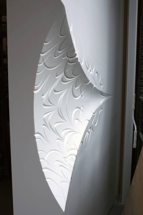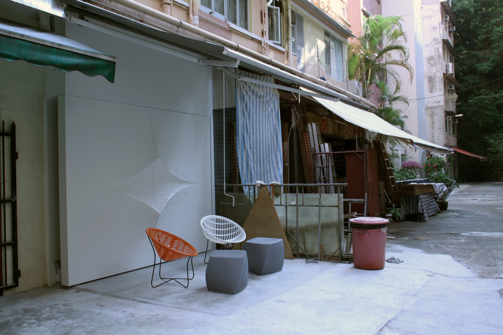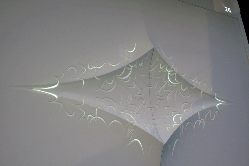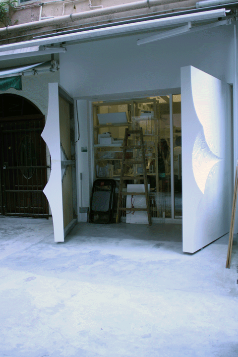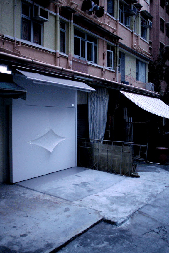 Yud Yud is the product of an evolving collaboration between plusClovers, artist C.E.B. Reas and DuPont China. It is the first application of back lit Corian™ exterior in China. Set within an old, medium density walking area of Wan Chai, Yud Yud stands in contrast to its surroundings. It builds upon the persona of the typical Hong Kong gate, pushing it toward the enigmatic. Designed from the interior to extend the pinup space of the plusClovers studio it is designed to be explored, touched and engage other forms of sight. Onlookers have been found rubbing it. It is an urban artifact not meant to be fully understood but capture and interact with one’s imagination. Much of the visual and spatial ambiguity of the storefront lie in the tension designed between dimensions. For instance, two and three dimensions are blurred by both forming and etching an otherwise matte, Corian™ facade. The design engages the fourth dimension using animated LED lighting that produces a “twilight” affect. What appears heavy and dense at moments reverberates between opaque, translucent and transparent; slowly pulsing etched lines appear and then fade out and disappear.