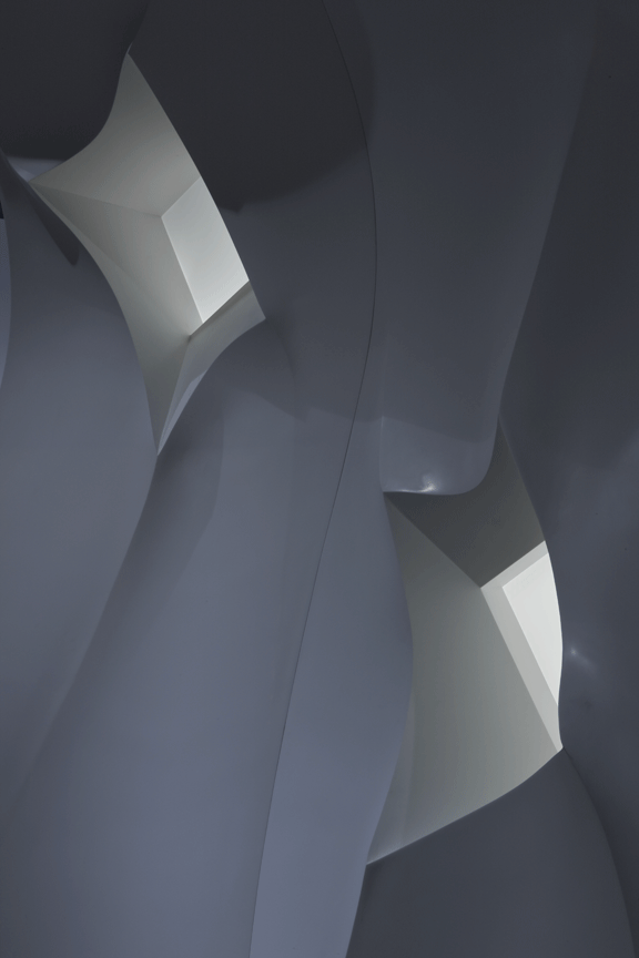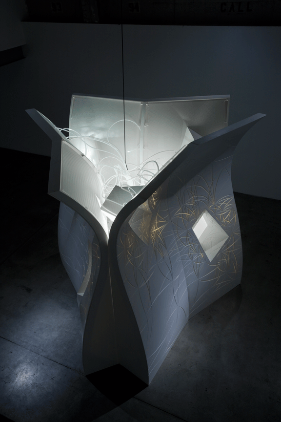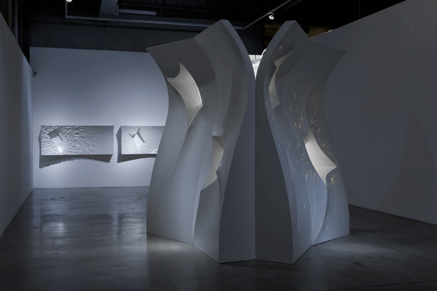 PlusClovers’ installation Immuring is currently on view at SCIArc until July 18, 2010. Immuring consists of six full-scale prototypes that were developed in collaboration with LA-based artist C.E.B Reas as the cladding system for Lunar House. The cladding system - the exterior enclosure of a typical suburban home - is re-imagined as a fresco that pushes the third and the fourth dimensions. Immuring is a material study that takes the fresco’s illusive and painterly effects explores them in new scales - between Reas’ artwork and PlusClovers’ architecture. Three prototypes use Corian Exterior cladding, a flat panel material that is etched and formed to shape light and texture. The etching extracts material to create zones of thinner material, allowing for programmed, fiber optic lighting from behind to glow through the material. Using the identical fresco line work, three prototypes use Glass Fiber Reinforced Concrete (GFRC) as an alternative to the Corian cladding. This is fabricated using an additive process that builds up material on a wax mold. As such, these prototypes produce different effects with different means, yet both are nuanced and delicate, actually thin yet appearing tremendously thick.