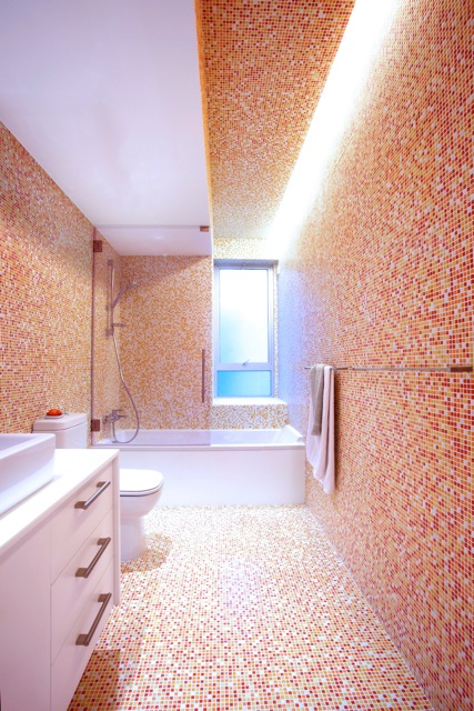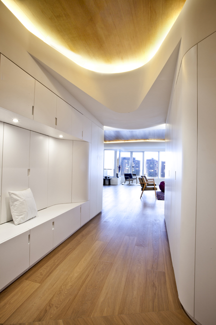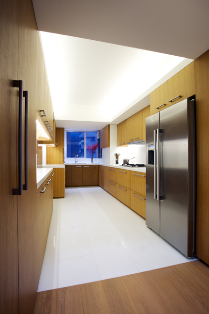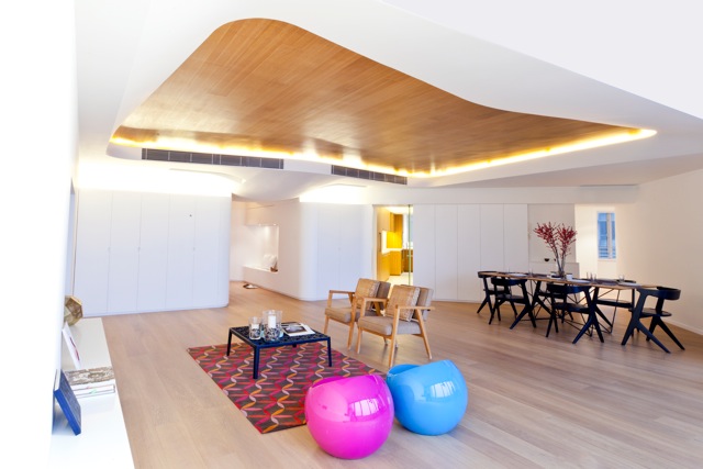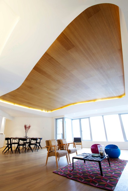 Nestled amongst a forest of towers on Old Peak Road above Central Hong Kong, the Tregunter tower holds unique layered views of Victoria Harbor. The abundance of bay windows, structural walls and beams that are common to residential towers would appear to constrain the possibilities of the apartment. However, by turning constraints into opportunities, plusClovers re-works the volumes of this apartment by using the ceiling and the floor. Subtly elongating, pressing upward, and sloping downward, the ceiling produces variable sensations of compression and expansion – making the apartment seem larger than it is, drawing delicate lines that separate dining from living. Skillfully dodging and maneuvering around air-conditioning units and structural beams, the ceiling integrates artificial light and various materials – re-orienting the apartment toward the exterior. The minimal use of wood and plaster shift the elevation of the apartment (typically on the walls) to the horizontal surfaces – enhancing the outward/upward thrust of the ceiling. Cabinets painted white, thicken and absorb storage, entertainment systems and integrate bench seating. Materials are used three-dimensionally throughout the apartment. Wood rotates from floors and ceilings to walls in the kitchen and mosaic tiles brighten toward windows in the bathrooms making the illumination from windows seem even brighter.