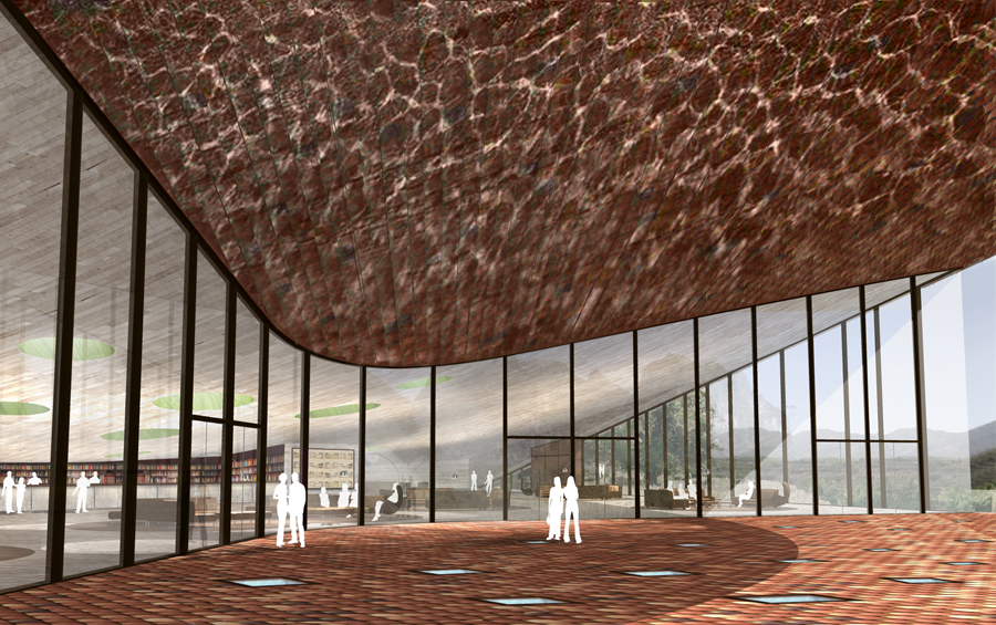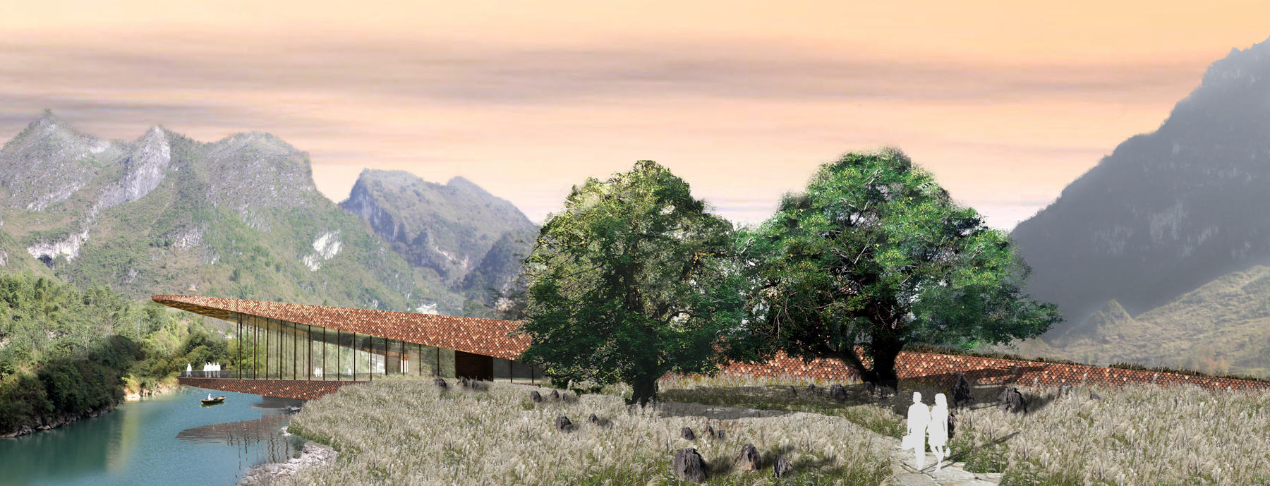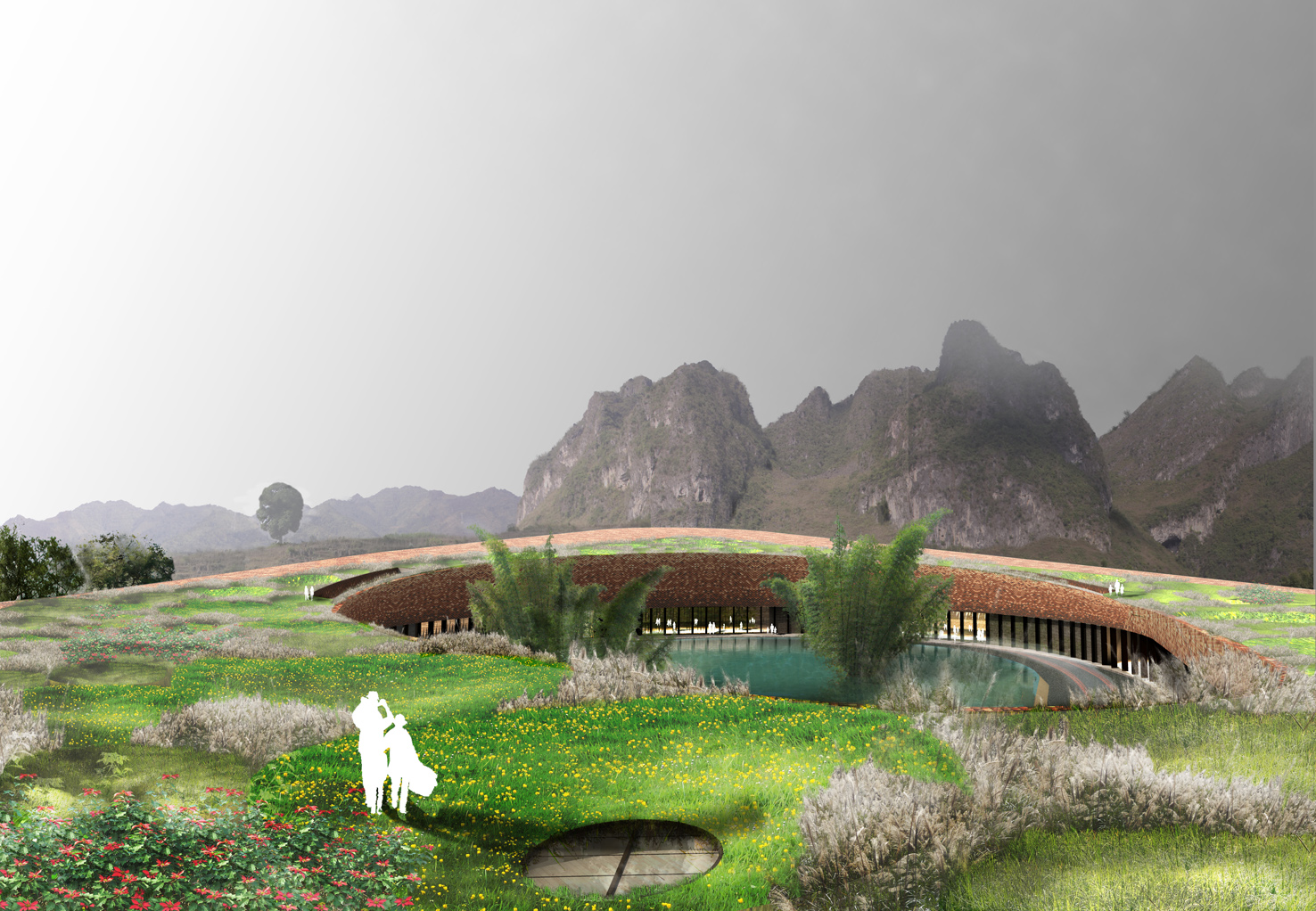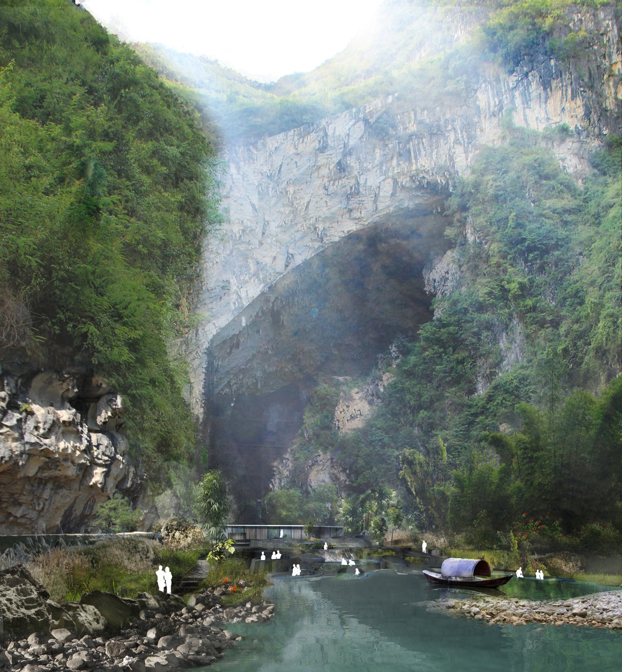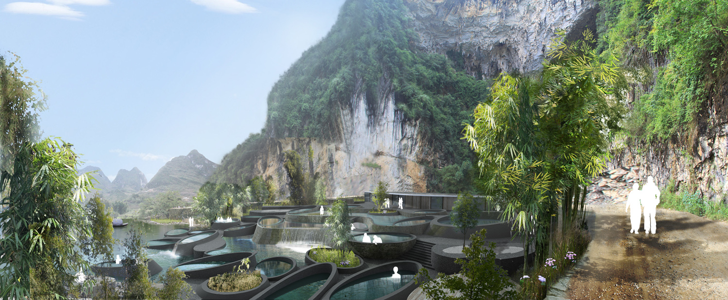 plusClovers was hired in 2010 to work on two key areas of an eco-tourist resort that intends to be a flagship project for China demonstrating how architecture can both re-work and reinvigorate sensitive habitat sites. Using innovative construction methods and design processes both projects “far” the existing terrain of the site finding its latent potentials. Clad using a custom terracotta tile that is intended to blacken over time the arrivals building is mostly below grade, flanking the river. Comprised of a series of earthen disc-skylights, daylight and artificial light emit different colors from the “native habitat garden” through skylights in to the floors below. Managing storm and gray water, the garden is a collection point for tourists where glimpses of the major landmarks and tourists below are revealed. Cantilevered over the river, the building harnesses the sensorial aspects of the site. Using water’s reflection, sound and the color of the vegetation above, the building immerse guests prior to their boat journey to the hotel. An archipelago of differing speeds, depths, colors and textures of water, the therme area is set at the base of Baimo cave. Sprinkling landscape, lighting and small changing room buildings through a network of paths, the therme uses small and large pools to coordinate differing zones of privacy and spa activities in the river.