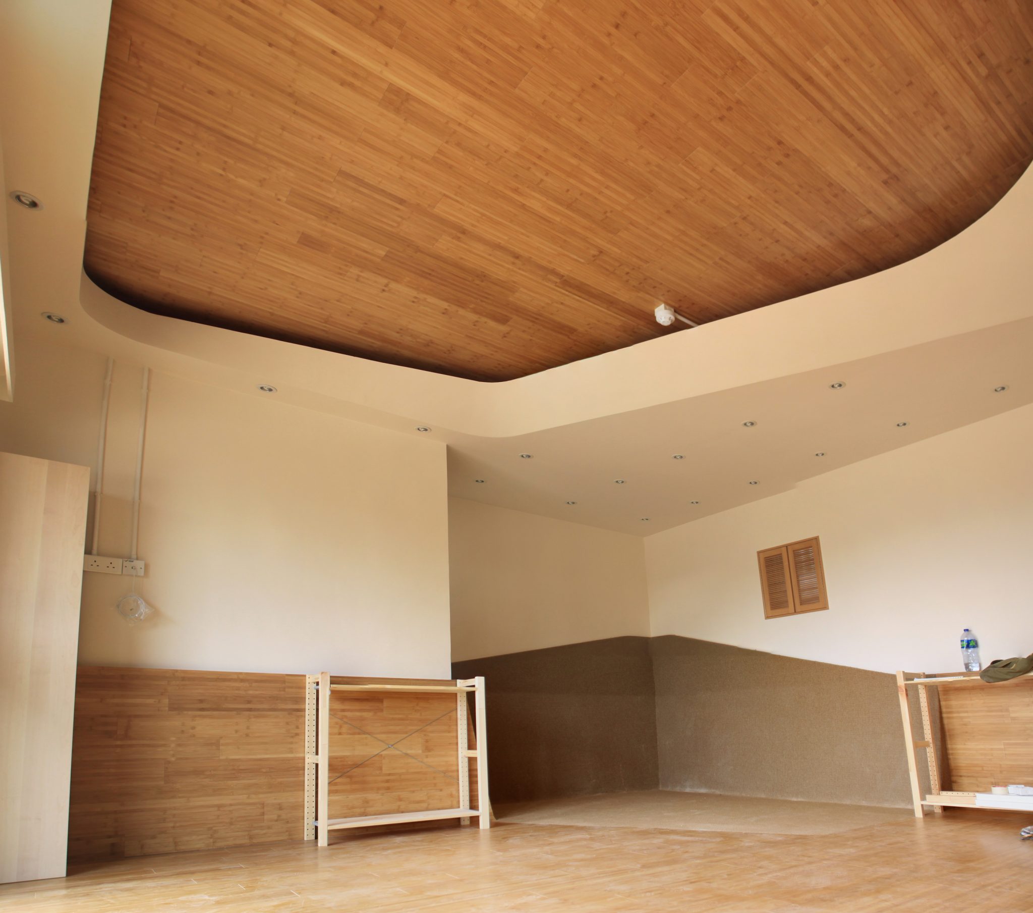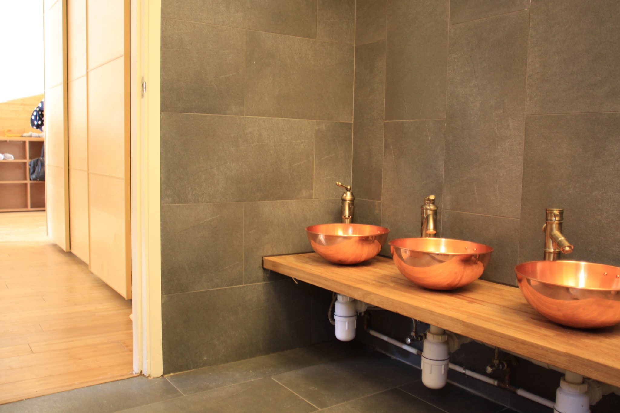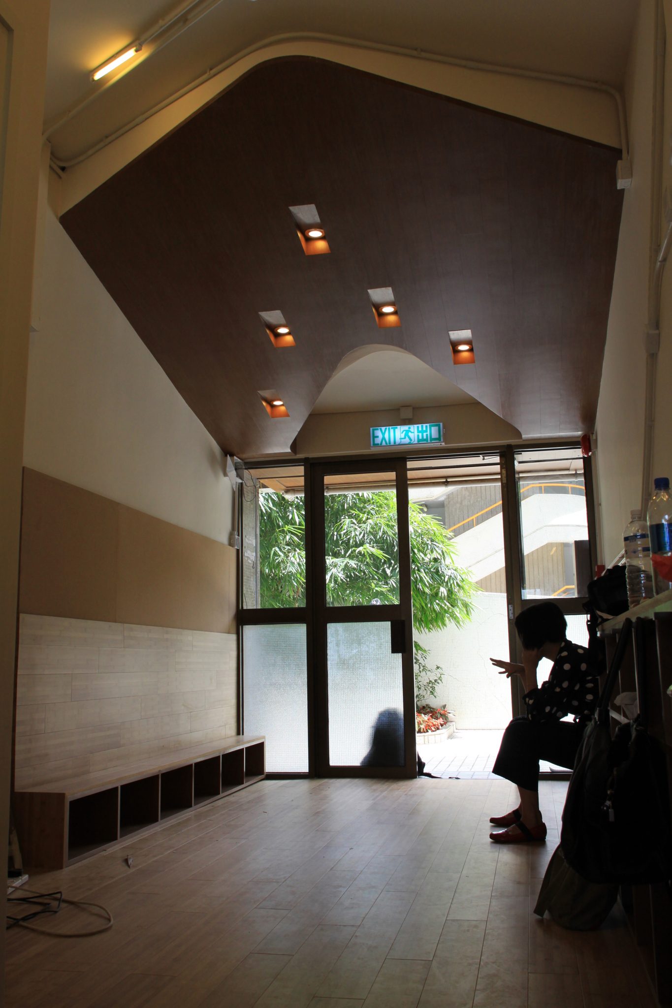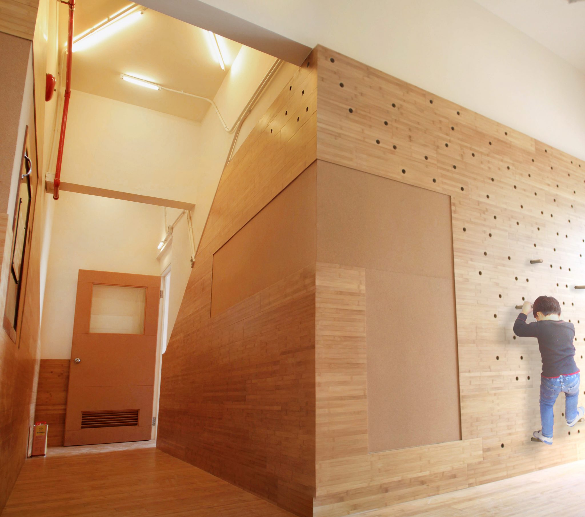 Situated in a small ground floor space below a residential tower in Hong Kong, Morningstar Preschool makes use of two core design elements in a children’s educational facility – wainscoting and lighting – to create an innovative educational space. PlusClovers uses these two elements to unify rooms that are separated and to convert circulation space into spaces of education. The bamboo wainscoting transforms from benches to shelving, to reading “pads” and to climbing walls, moving in and out of class rooms and hallway areas. Shifting from something you sit on, stuff things in, rest upon and climb on, the wainscoting not only operates spatially but also as a tactile learning tool – challenging students to re-work it, re-use it and interact with it. Exposed lighting conduits are configured into “climbers” with fluorescent pedals, creating a distinctly different lighting atmosphere from the classrooms. PlusClovers conceived of these ivy-like lighting conditions as frescoes that allow the students to interpret and recognize different patterns of lighting, material and organization. The architecture, its materials, mood and atmosphere deviate from normative classrooms both in appearance and design – transforming from one thing into another, never stabilizing in identity. The sign on the exterior for instance folds across the door and becomes the ceiling under which students remove shoes, while copper mixing bowls become sinks with different faucets in the bathrooms. While physically constrained, the ensemble of environments results in a landscape of opportunity and learning, of different sensations and interpretations.