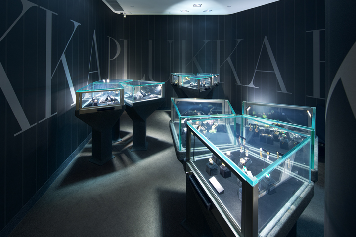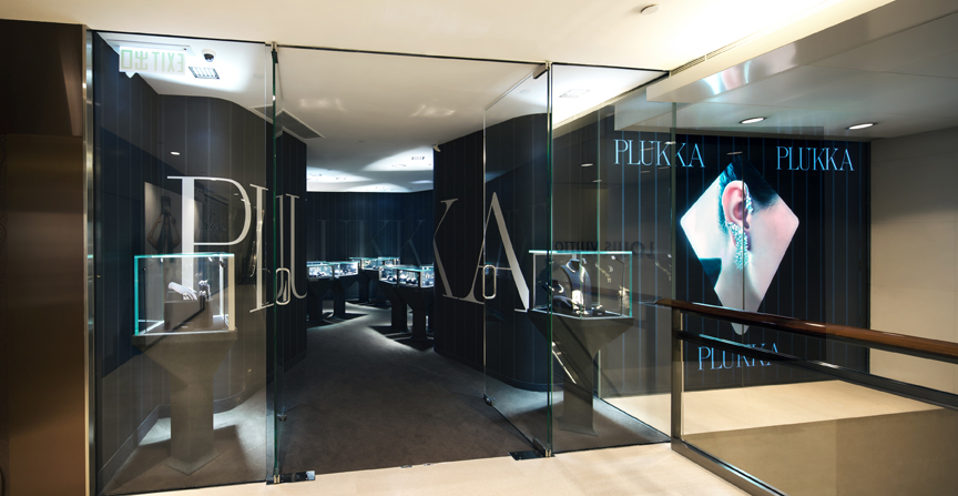 All black and forming the apse of a dead-end retail corridor, the design for Plukka’s first pop up store transcends the stereotypical jewelry store. Located in one of the most coveted retail locations in Central Hong Kong, Plukka stands out as black-hole loop that draws one into its mysterious environment. Joanne Ooi, CEO and founder, of Plukka hired the dynamic team of Johnston Marklee (based in Los Angeles) and davidclovers (Hong Kong) to design their first “brick and mortar” presence .Plukka is an online brand with a new reatiling concept that harnesses a unique collection of avant-garde jewelry and designers. For Plukka to hit the fashion scene and full sprint Ooi wanted a design that is exclusive and intimate, yet stood out; that is elegant and luxurious, yet experimental and edgy. The design team came up with a simple concept that treats the store as an apse-void with a collection of object-like stands floating within it. The curvature of the enclosing walls reveals and conceals the collection, collapses and expands the space. The pin stripe wall paper (which fades as it revolves around the store) augments this effect and is tangibly noticeable from afar as it spills out onto the light box at the entry. The store has an alluring presence as one promenades through the retail destination. The design is at once introverted, intimate and extroverted due to the combination of its form and graphic articulation. The prefabricated display jewelry cases form pedal-like clusters that emerge out of the flooring. The break-down of a single larger display case into 11 smaller cases allows Plukka to showcase individual designers, smaller collections or a single designer – which they do once a month at their self -titled “animation” events.
